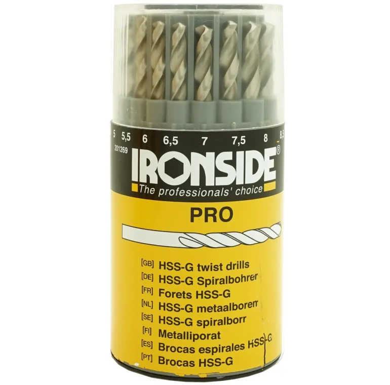 Poranteräpakkaus, joka sisältää 19 hiottua HSS-pikateräsporanterää. Pyörivä kansi yhden poranterän poistamiseen kerrallaan.