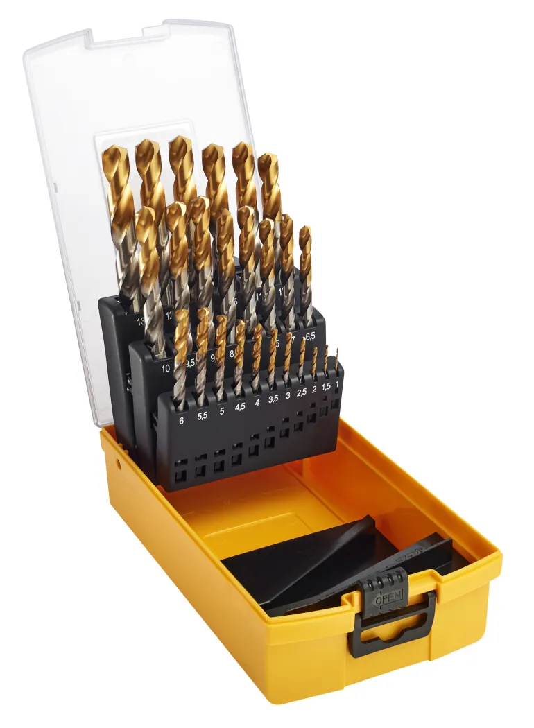 25 poranterän sarja 1-13 mm (0,5 mm:n välein). DIN 338, suorat sylinterimäiset varret ja TIN-pinnoitetut kärjet. Jaettu kärki auttaa keskittämään poran.