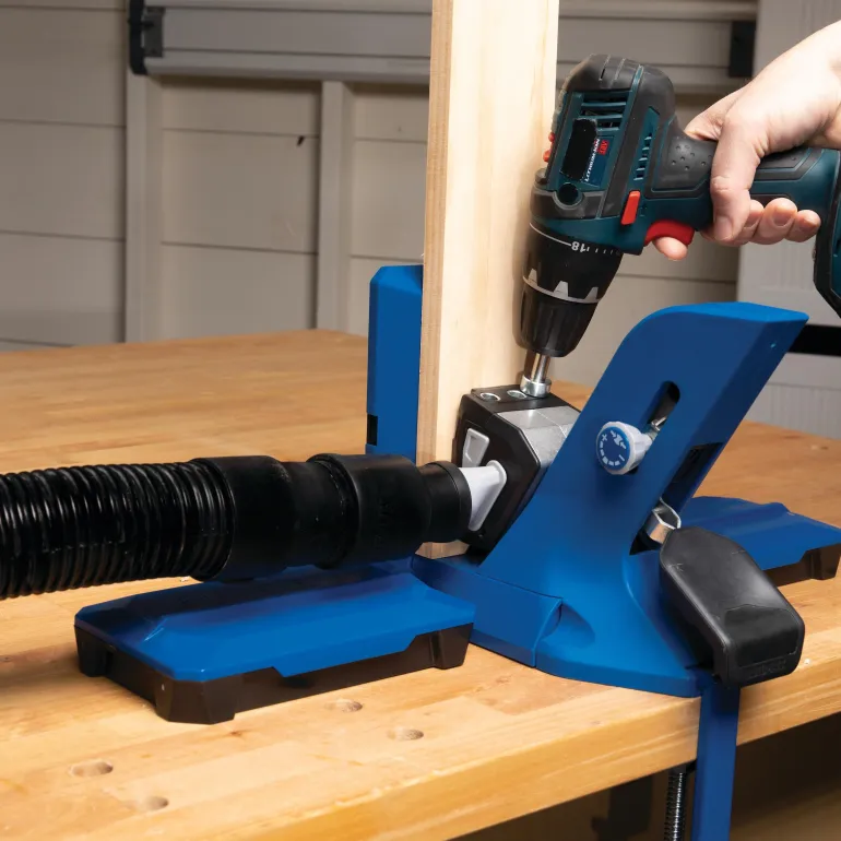 Kreg Pocket-Hole Jigi 720PRO on Kregin monipuolinen poraohjain, joka toimii eri projektirakennustarpeisiin. Kiinnitä materiaali Automaxxilla, joka sopeutuu automaattisesti materiaalin paksuuteen. Materiaaleille, joiden paksuus on 13-38 mm. GripMaxx Anti-Slip Material pitää projektikappaleen tukevasti paikallaan, joten sinun ei tarvitse koskaan huolehtia sen liikkumisesta porattaessa. Kiinnittimen avulla voit liittää pölynimurin ja pitää työpinnan pölyttömänä. Sisäänrakennettu työkalusäilytys pitää tarvikkeet, kuten kuusiokoloavaimen ja poranterät, käden ulottuvilla. 720PRO:n mukana tulee Kreg Docking Station-materiaalitukisiivet pysäyttimellä sekä Pocket-Hole Jig Clamp. Käytä Pocket-Hole Jig Clamp-työkalua kiinnittääksesi jigisi työpisteeseen, kun taas materiaaliset tukisiivet tarjoavat tukea porattaessa suuria paloja.