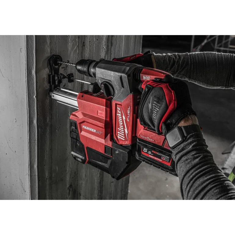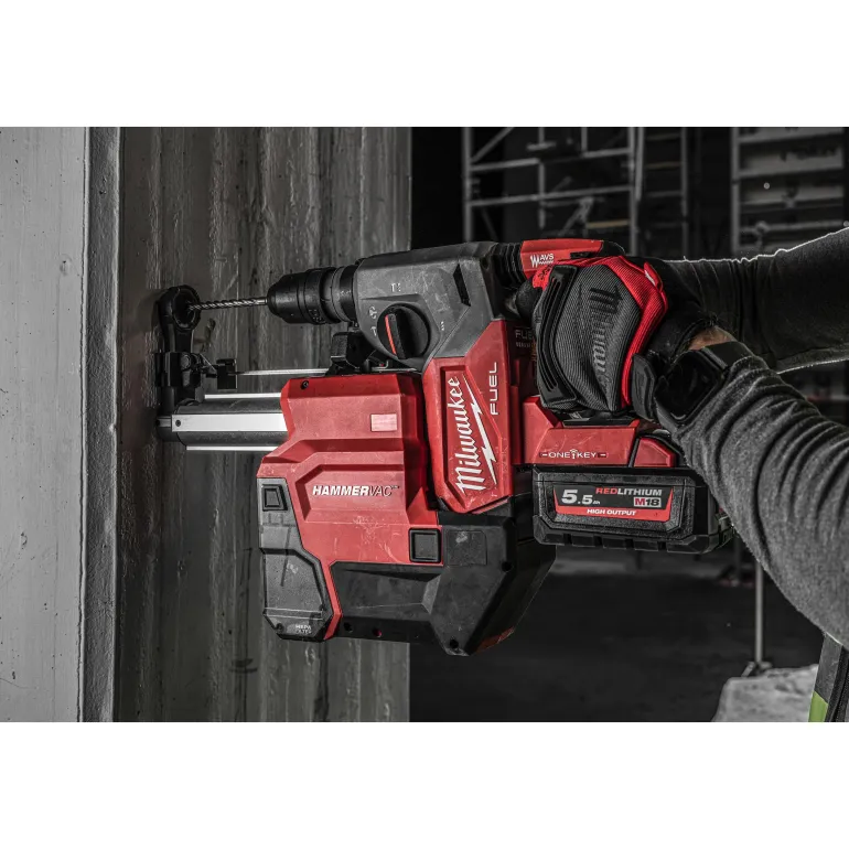 Toimitukseen sisältyy: 2 x 5.5 Ah REDLITHIUM HIGH OUTPUT-akkuja, 59 min M12-18FC-laturi, M18 FDDEXL-pölynimuyksikkö (pölynimuri), 13 mm FIXTEC™- sekä SDS-Plus-istukka ja laukku.