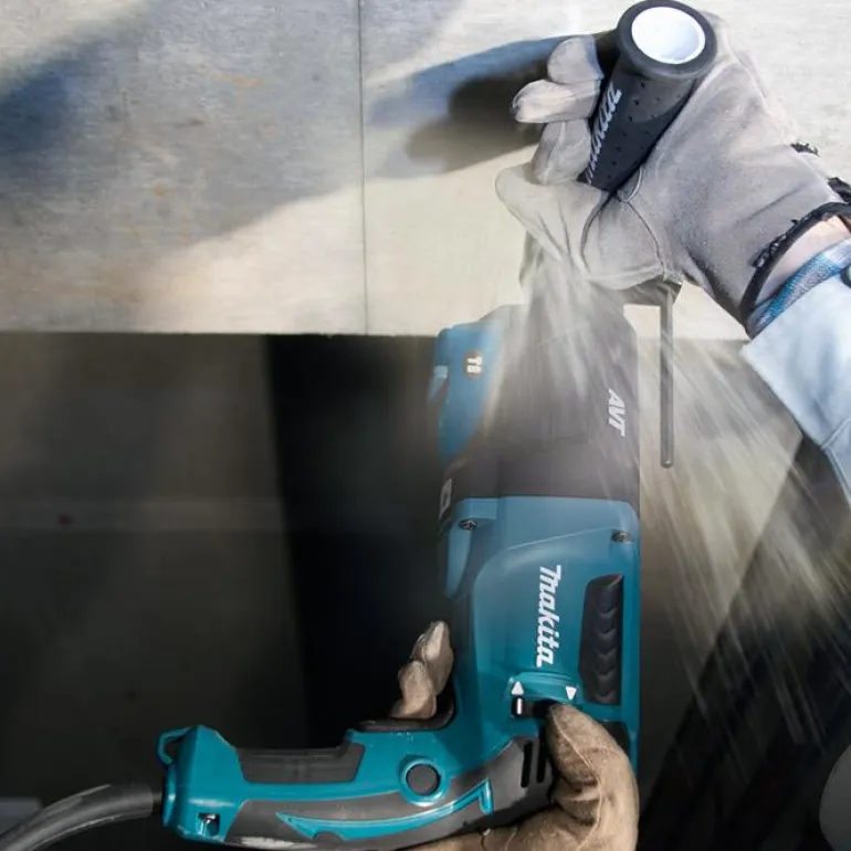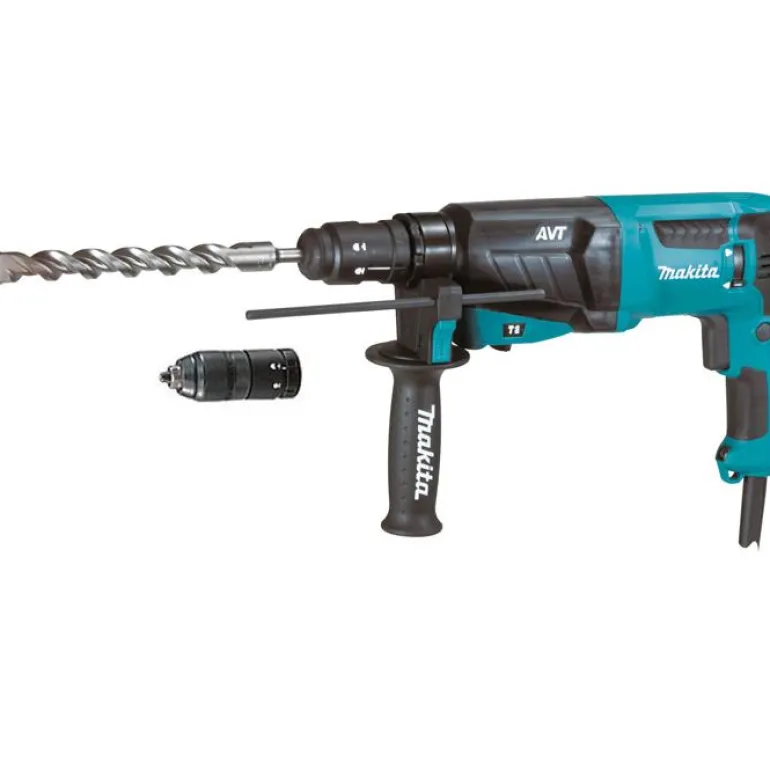 Makita HR2631FTJ -poravasara, 800 W, SDS-Plus-kiinnitys, porausteho betoniin jopa 26mm. Iskuporaus, poraus ilman iskua ja piikkaustoiminto. AVT-tärinänestojärjestelmä vähentää voimakkaasti tärinää.