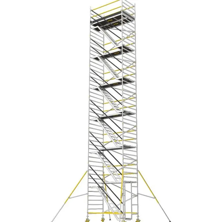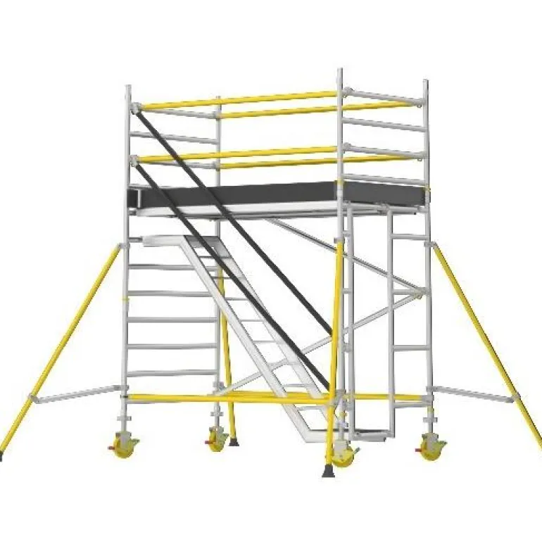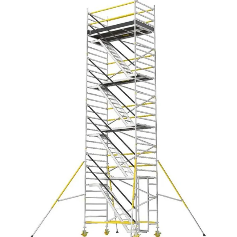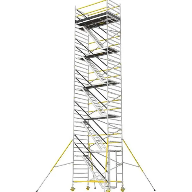 Erittäin tukeva ja helposti koottava porrasteline (tason korkeus 4,2 m), jossa on limittäiset tukisiteet antamassa turvallisemman työnteon korkeissa korkeuksissa. Täydellinen portaiden ja tasojen (kahden metrin välein), jalkalistojen, säädettävien pyörien (200 mm) ja tukijalkojen kanssa.