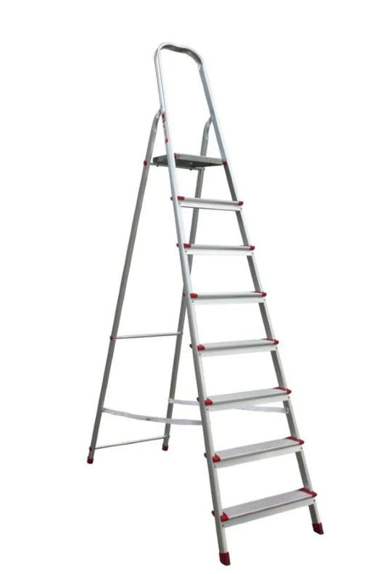 Alumiinista valmistetut porrastikkaat 8 askelmalla, jonka taso on galvanoitua peltiä. Tikkaat ovat käytännölliset ja tarkoitettu kevyeen käyttöön.