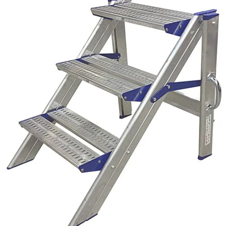 Kaksiaskelmaiset porrastikkaat tukevaa alumiinia. Askelman leveys on 45 cm ja syvyys 25 cm. Askelmien syvät rihlaukset takaavat liukumattomuuden. Leveys 60 cm ja tason korkeus 47 cm.