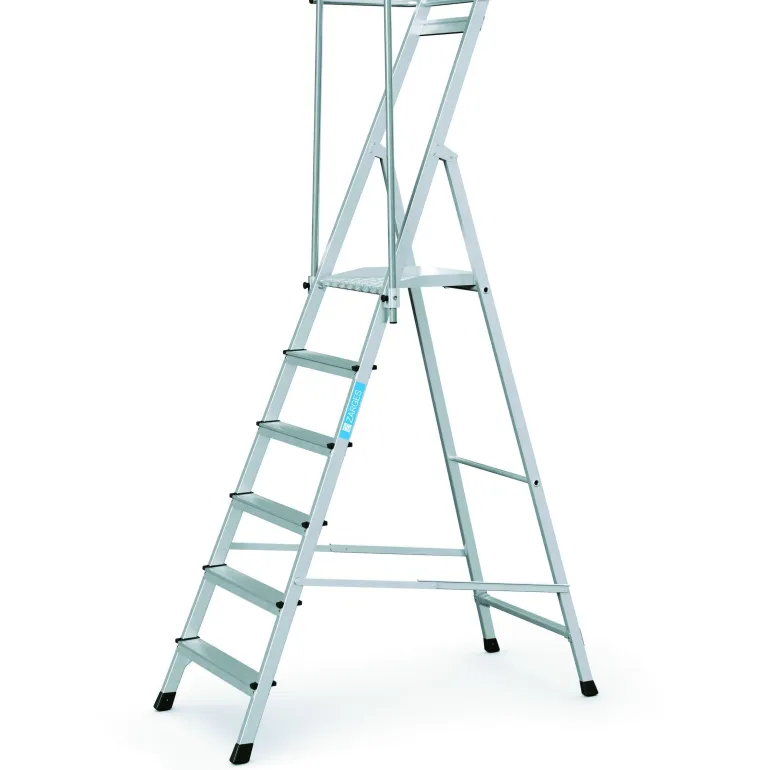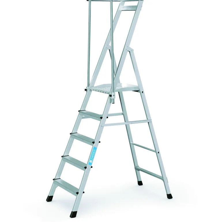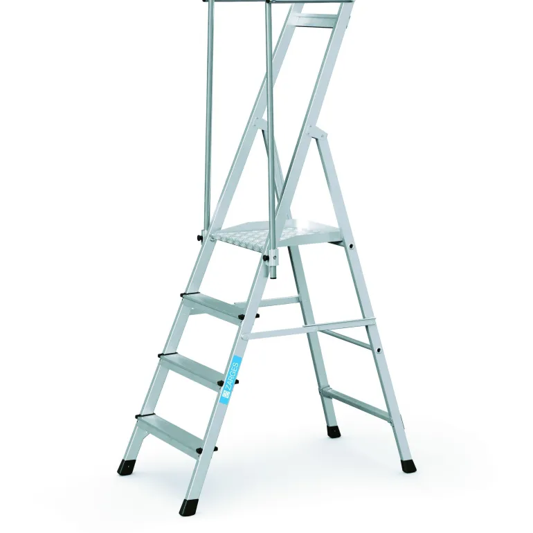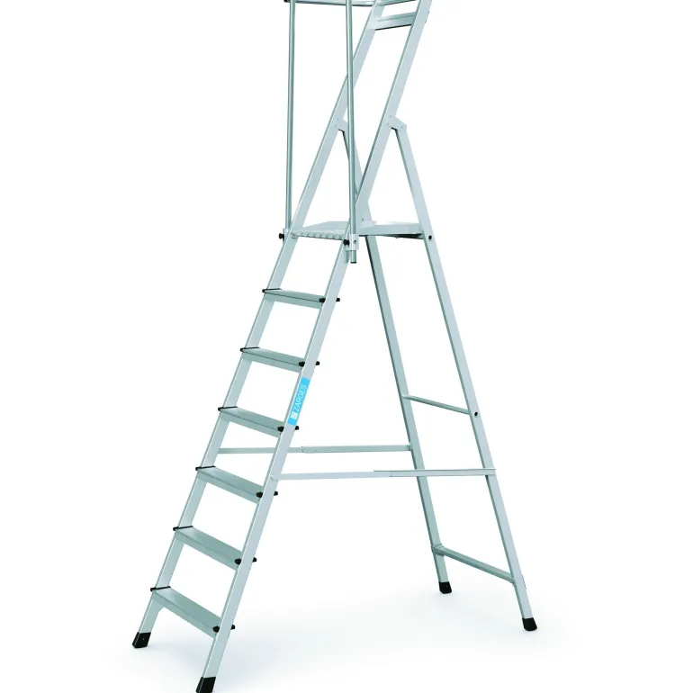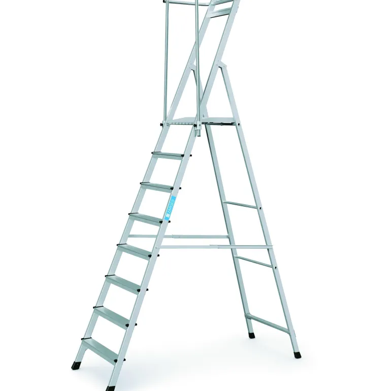 Superkevyet porrastikkaat kokoontaitettavilla kaiteilla ja suurella 400 x 400 mm tasolla. Tikkaissa on kolmipuoliset kaiteet, joiden korkeus on 1 m, mikä takaa parhaan mahdollisen työturvallisuuden, ja taitettava kahva mahdollistaa tilaa säästävän kuljetuksen.