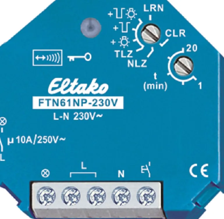 1 potentiaaliton NO-katkaisin, 10A/250V AC, 2000 watin polttimot, sammutusviive sammutusvaroituksella ja pysyvästi kytkettävällä valolla. Vain 0,7 wattia virrankulutusta valmiustilassa. Käyttöjännite 230 V. Nollakytkin tallentaa yhteystiedot ja käyttäjät. Tätä automaattista porrasvaloautomaattia voidaan ohjata sekä radio-ohjaustulolla, jossa on integroitu