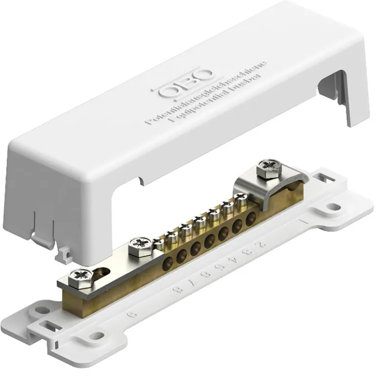 Potentiaalintasauskisko, pohjalevy ja kansi luonnonkuitua, kisko lyijytöntä messinkiä. Liitäntä: 7xMK 25 tai 7xRK16 mm² sekä 1xpyöröjohdin ø 8 mm tai nauha maks. 30 mm