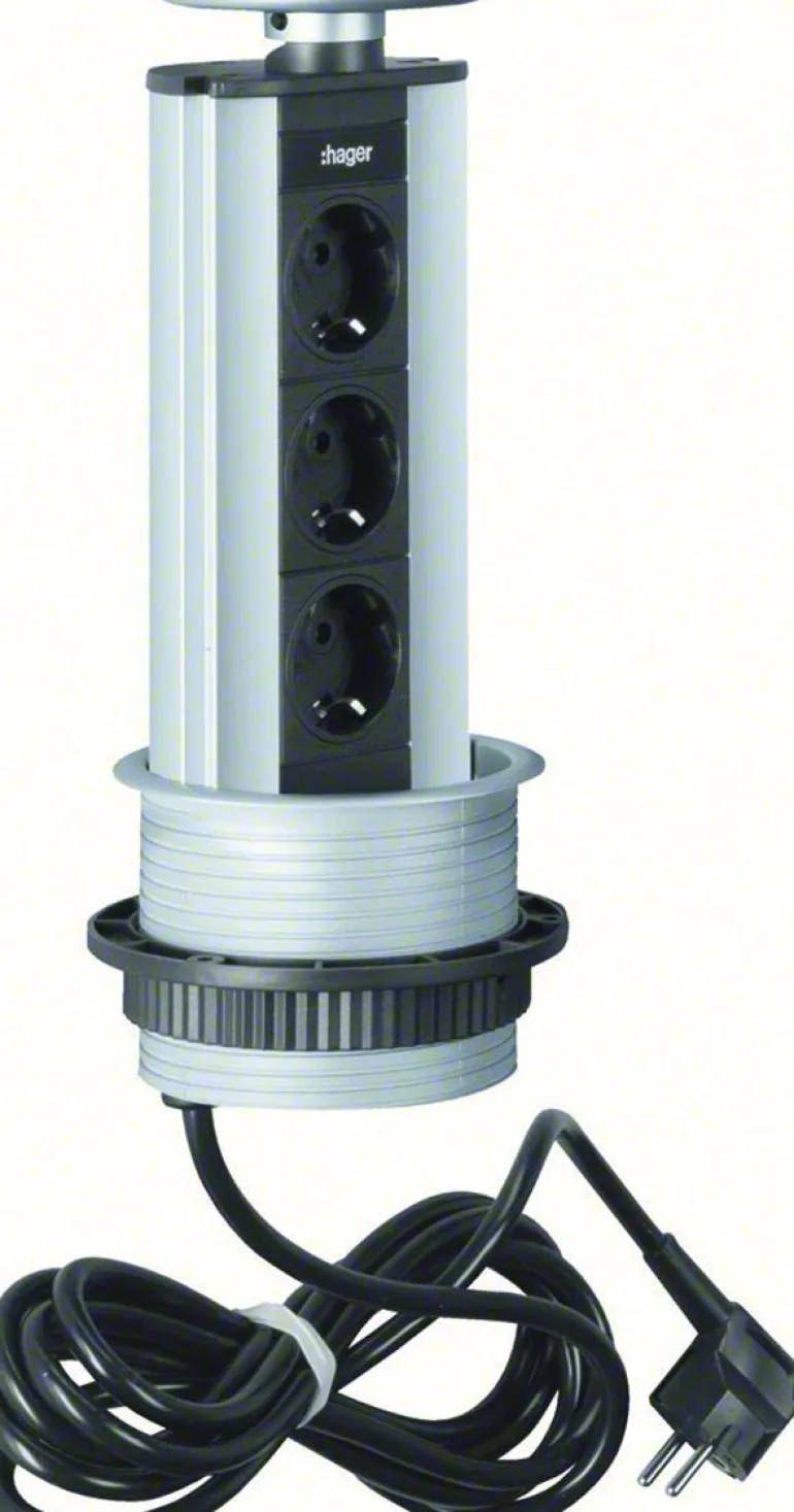 Esiasennettu pöytämoduuli jossa 3 pistoketta ja LED-valo sekä 3 m liitäntäkaapeli. Pop-up-pöytämoduulin avulla virtapistokkeen voi kätkeä keittiön tasoon, keittiönkaappiin, työpöytään tai neuvottelupöytään. Kun tarvitset sähköliitäntää, vedä moduuli ulos ja kytke laite.