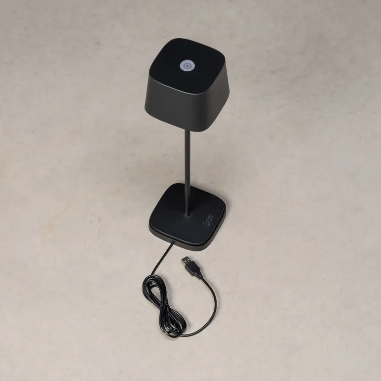 Capri on tyylikäs pöytävalaisin mustaksi lakattua alumiinia. Siinä on säädettävä ja himmennettävä valaistus eri värilämpötiloilla, ja se sopii yhtä hyvin olohuoneeseen kuin terassille. Ladataan USB:n kautta ja akun kesto on noin 9 tuntia täydellä valoteholla. Virtapainike toimii kosketuksella varjostimen pinnasta. Korkeus 36 cm.