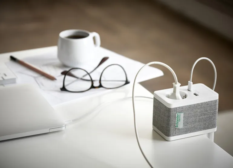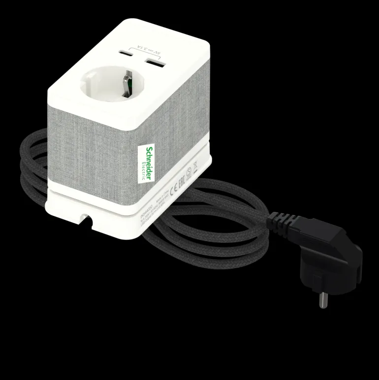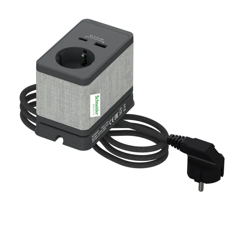 Pöytäyksikkö S, virta+ USB A+C. Yksikkö on päällystetty harmaalla kankaalla.