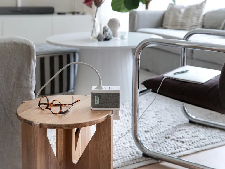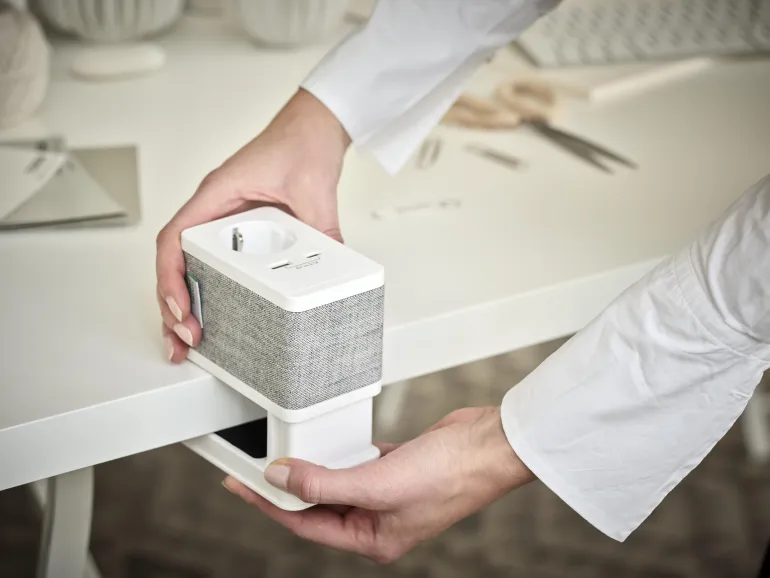 Pöytäyksikkö S, virta+ USB A+C. Yksikkö on päällystetty harmaalla kankaalla. Laite kiinnitetään pöydälle tai tasolle.