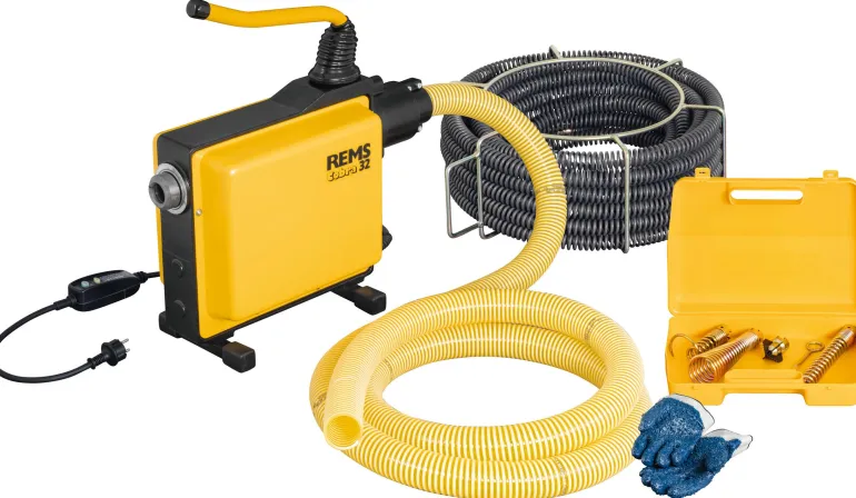 REMS Cobra 32 Set on sähköinen putkenpuhdistuskone putkille Ø20 – 250 mm. Koneessa on huoltovapaa hammashihnakäyttö, kondensaattorimoottori 230 V, 50 Hz, 1050 W, suunnanvaihto, suojaletku.