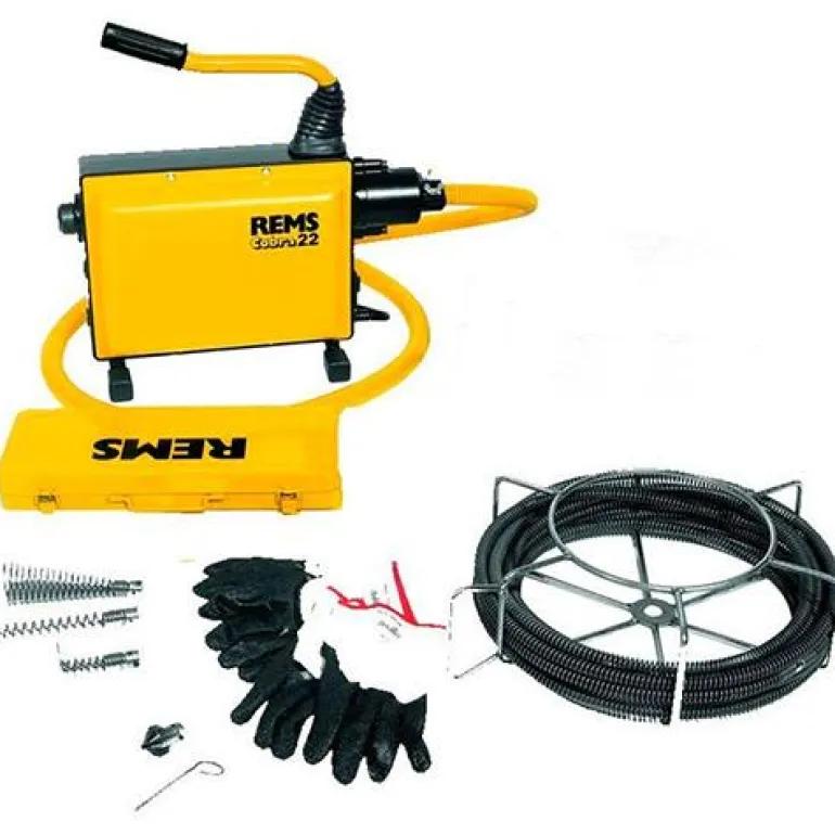 REMS Cobra 22 Set on sähköinen putkenpuhdistuskone putkille Ø 20 – 150 mm. Koneessa on huoltovapaa hammashihnakäyttö, kondensaattorimoottori 230 V, 50 Hz, 750 W, suunnanvaihto, suojaletku. Henkilösuojakytkin (PRCD). Kartonkipakkauksessa.