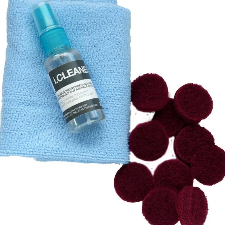 Puhdistussarja (väritön) esikäsittelyyn ja puhdistukseen ennen liimausasennusta. Sarja koostuu i.CLEANER-puhdistusnesteestä, puhdistusliinasta, puhdistustyynyistä ja liimanlevittimestä.
