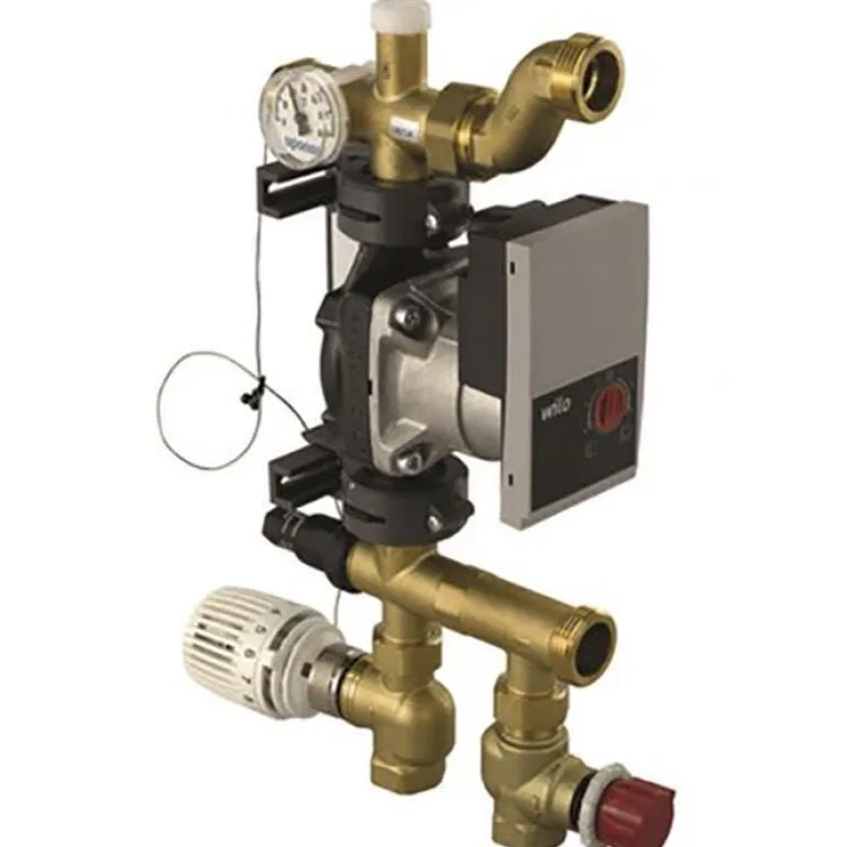Pumppuryhmä. Menoveden lämpötilan säädöllä varustettu sekoitusryhmä. Pumppuryhmä riittää n. 170 m2 pinta-alalle.