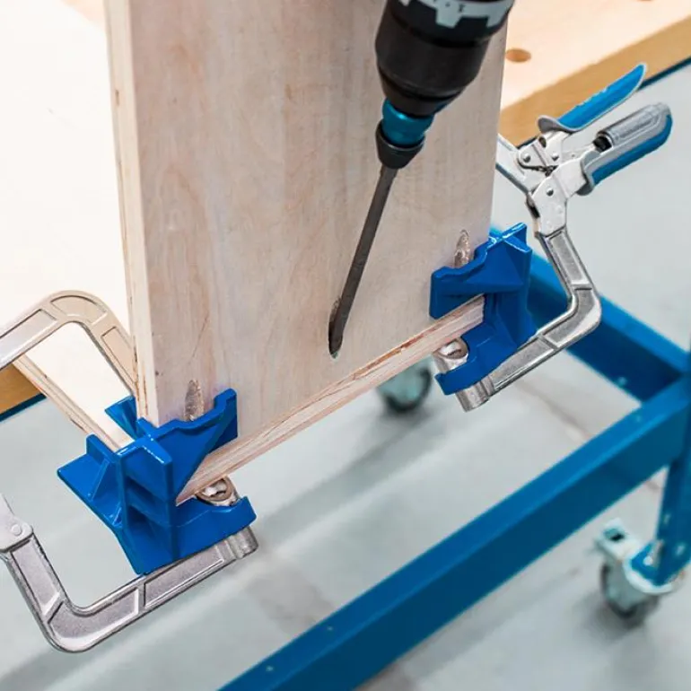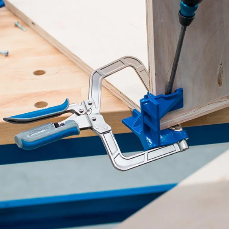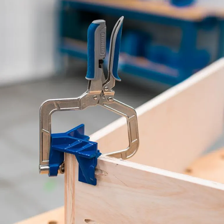 Kreg KHCCC -kulmapuristin soveltuu työkappaleiden automaattiseen liittämiseen 90 asteen kulmassa. Liitäntä kiristämällä. Soveltuu enintään 1 tuuman paksuisille materiaaleille.