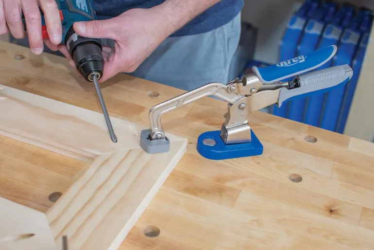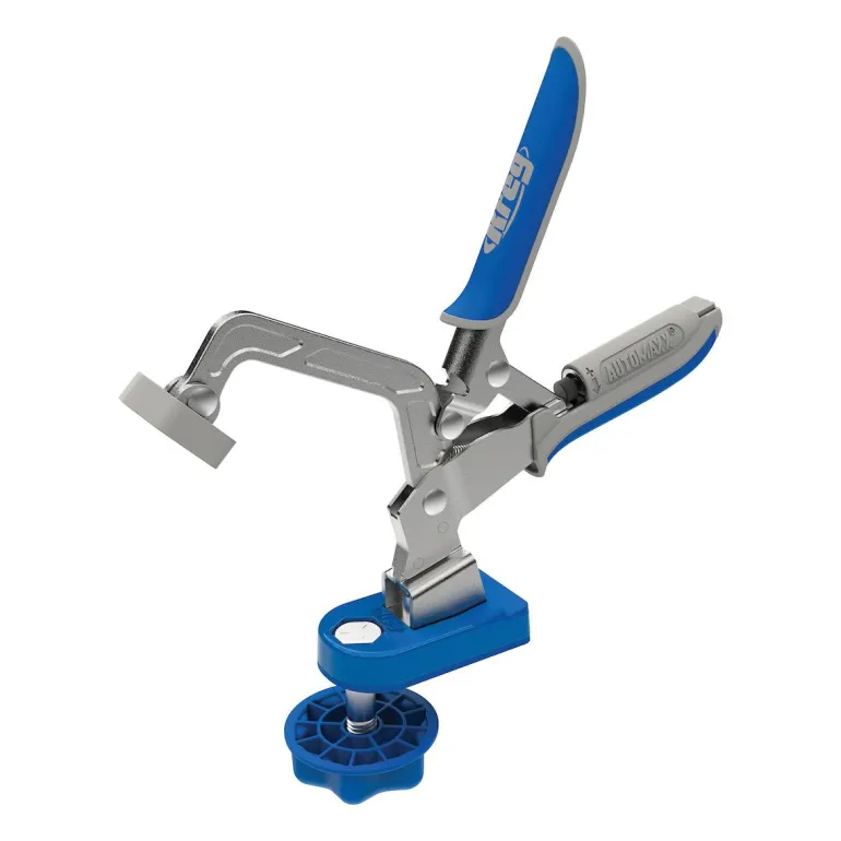 KREG KBC3-BAS yhdistää puristimen KREG Bench Clamp Base:n kanssa, jotta voit kiinnittää materiaaleja jokaiseen suuntaan käytännössä mihin tahansa työpöydälle. Bench Clamp Base kiinnitetään halkaisijaltaan 20 mm reikiin, joko KREG KWS1000-työpöytään tai työpöytään, johon olet porannut reiät itse. Voit nopeasti kiinnittää ja tehdä muutoksia lukituspainikkeella. Automaxxin ansiosta puristin on säädetty siten, että se sopeutuu materiaaliin automaattisesti kahvan painalluksella. Kahvassa olevalla ruuvilla säädetään materiaalin painetta.