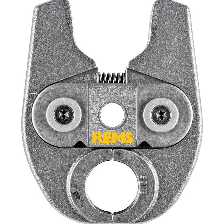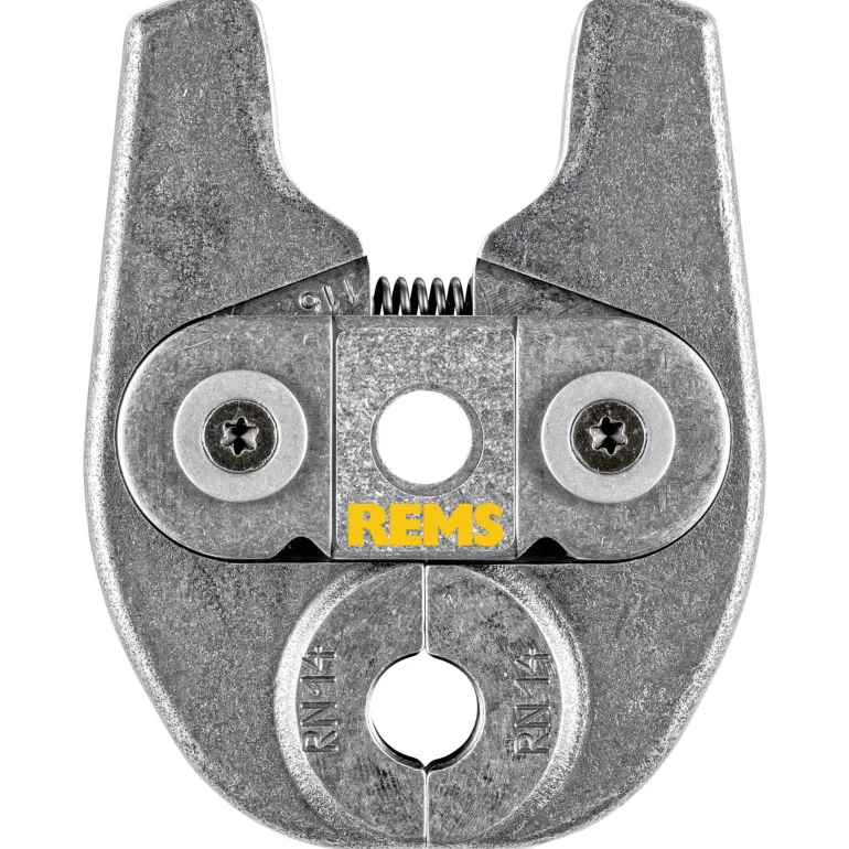 REMS 578434 Mini on kääntyvä yksilohkoinen puristusleuka, RN-kuvio, tyyppi RN 14 (PZ-2B). Puristusleuassa on erittäin kestävä, kompakti ja kevyt rakenne erikoissuunnitellun puristuspihtiliitännän ansiosta. Käytetään koneilla REMS Mini-Press ACC ja REMS Mini-Press 22 V ACC. Puristuskuviot ovat järjestelmäkohtaisia ja vastaavat kyseisen puristusmuhvijärjestelmän puristuskuvioita. Tämä takaa moitteettoman yhteensopivuuden järjestelmän kanssa ja varman puristuksen. Puristusleuassa on erittäin tarkka ja mekaanisesti tarkka CNC-koneistettu pyöristetty puristuskuvio. Tällä tavoin valmistustoleranssit ovat huomattavasti pienempiä kuin vain valamalla valmistetuissa puristusleuoissa.