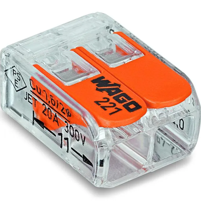 Wago 221-412 on 2-napainen puristusliitin 2-napaisille johtimille. Varustettu lukitusvivulla ja kahdella testireiällä. Puristusliittimessä on kaksi liitäntäasentoa, ja se on tarkoitettu johtimille, joiden poikkipinta-ala on 0,2-4 mm². Nimellisjännite 450 V ja nimellisvirta 32 A. 221-412 soveltuu joustaville, moni- ja yksisäikeisille johtimille. Toimitetaan 100 kpl:n pakkauksessa.
