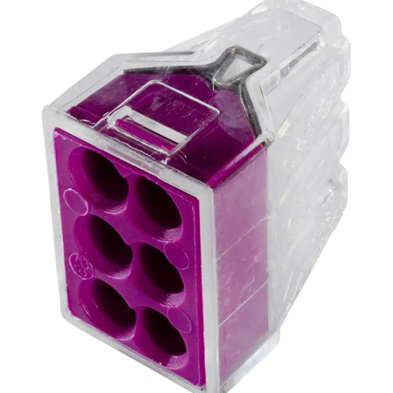 Wago 773 puristusliitin, jossa on 6 asentoa, jotka ovat yhteensopivat kaikentyyppisten kaapelien kanssa, FK 1,5–2,5 mm², EK 0,75–2,5 mm². Pieni ja helppokäyttöinen liitin vie vain vähän tilaa kytkentärasiassa. Toimitetaan 10 kpl:n pakkauksessa.