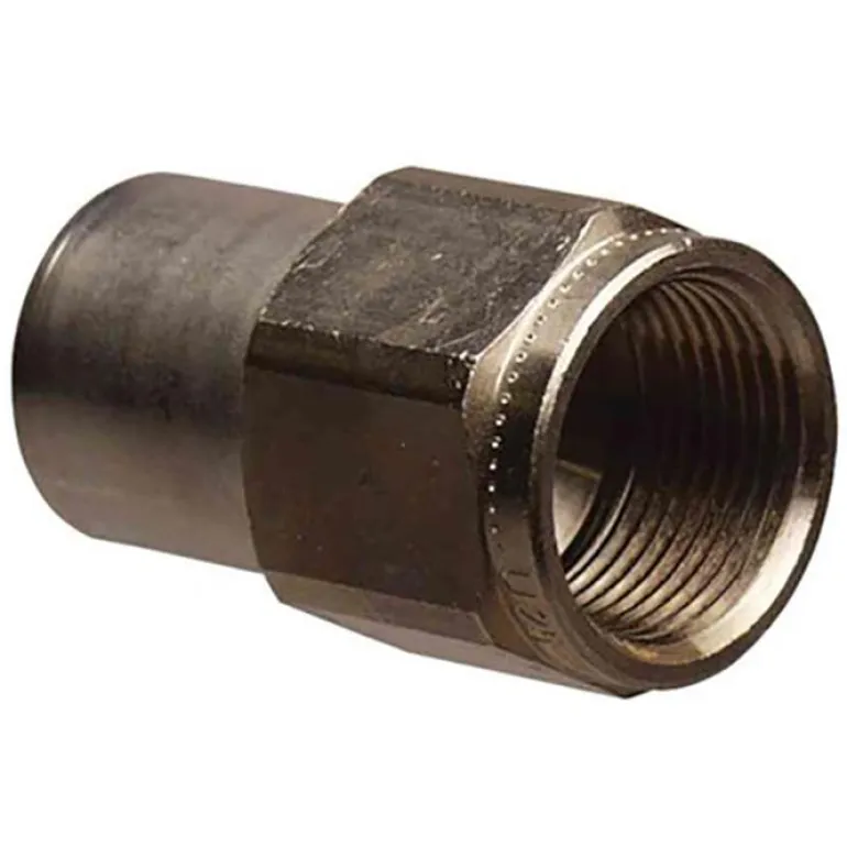 Puristusliitin, sisäkierreliitännällä 40 (1 1/2″) ja putken halkaisija 50 mm. Liitännässä on vuodonilmaisin, joka osoittaa puristamattoman liittimen vuototestauksessa, ja ikkuna, josta voidaan tarkistaa, että putken asennussyvyys on oikea.