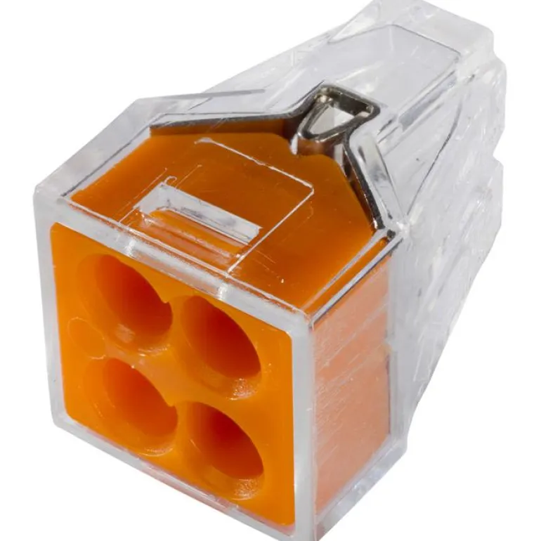 Wago 773 puristusliitin, jossa on 4 asentoa, jotka ovat yhteensopivat kaikentyyppisten kaapelien kanssa, FK 1,5–2,5 mm², EK 0,75–2,5 mm². Pieni ja helppokäyttöinen liitin vie vain vähän tilaa kytkentärasiassa. Toimitetaan 10 kpl:n pakkauksessa.