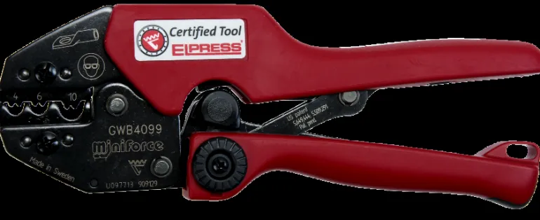 Testatut ja sertifioidut mekaaniset Miniforce-käsipihdit eristämättömien rengas-, haarukka- ja tappikaapeliliittimien sekä KR- ja KS (4-10 mm²) -tyyppisten putkikaapelikenkien ja liitosholkkien W-puristukseen.