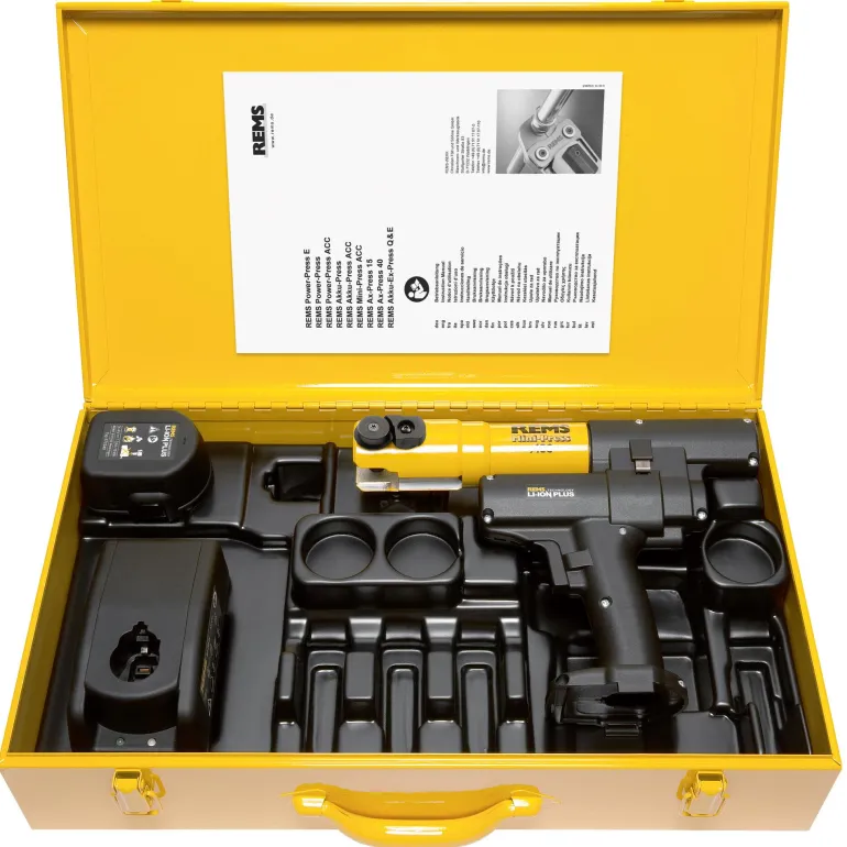 REMS Mini-Press on 14,4V:n akkukäyttöinen puristin, jossa on automaattinen sisäänveto puristusliitosten valmistukseen Ø 10 – 40 mm, Ø ⅜ – 1 ¼”. REMS-puristuspihtien käyttöön, Mini/puristusrenkaat. Kierrettävä puristustyökalun kiinnitys, automaattinen lukitus.