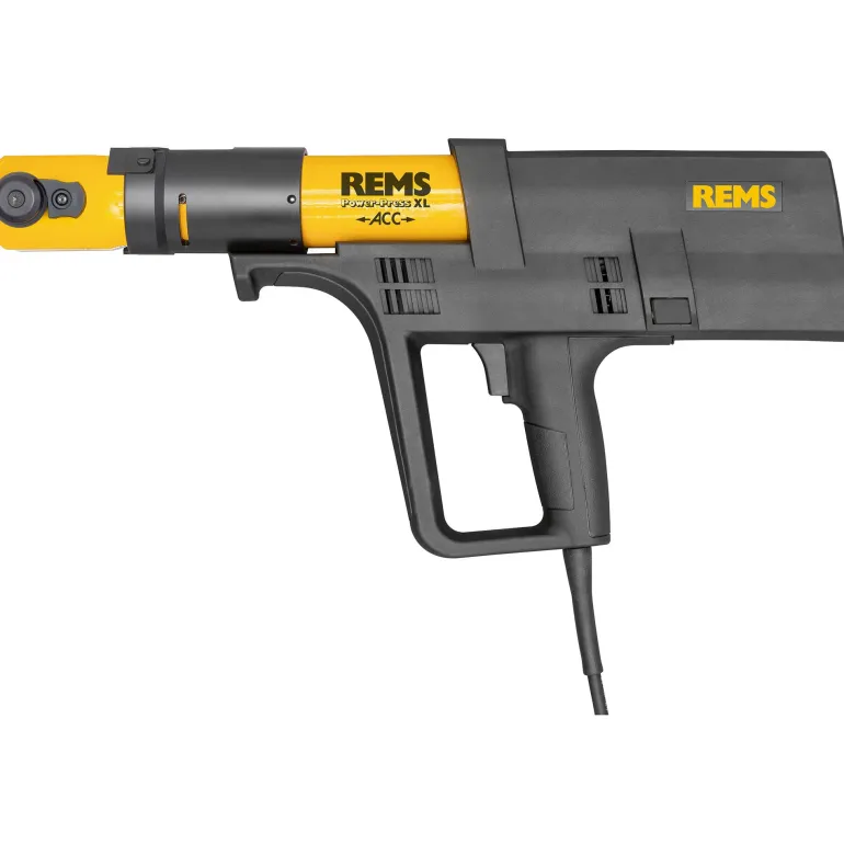 REMS Power-Press XL ACC on sähköhydraulinen puristin, automaattinen palautus, puristusliitosten valmistukseen Ø10 – 108 (110) mm/Ø ⅜ – 4″. REMS-puristuspihtien/puristusrenkaiden/XL-puristusrenkaiden ja muiden valmistajien puristuspihtien/puristusrenkaiden käyttöön. Kierrettävä puristustyökalun kiinnitys, automaattinen lukitus. Sähköhydraulinen käyttö, luotettava yleismoottori 230 V, 50 – 60 Hz, 450 W, kestävä planeettavaihde, epäkeskomäntäpumppu, kompakti korkean hyötysuhteen hydrauliikkajärjestelmä, turvakytkin.