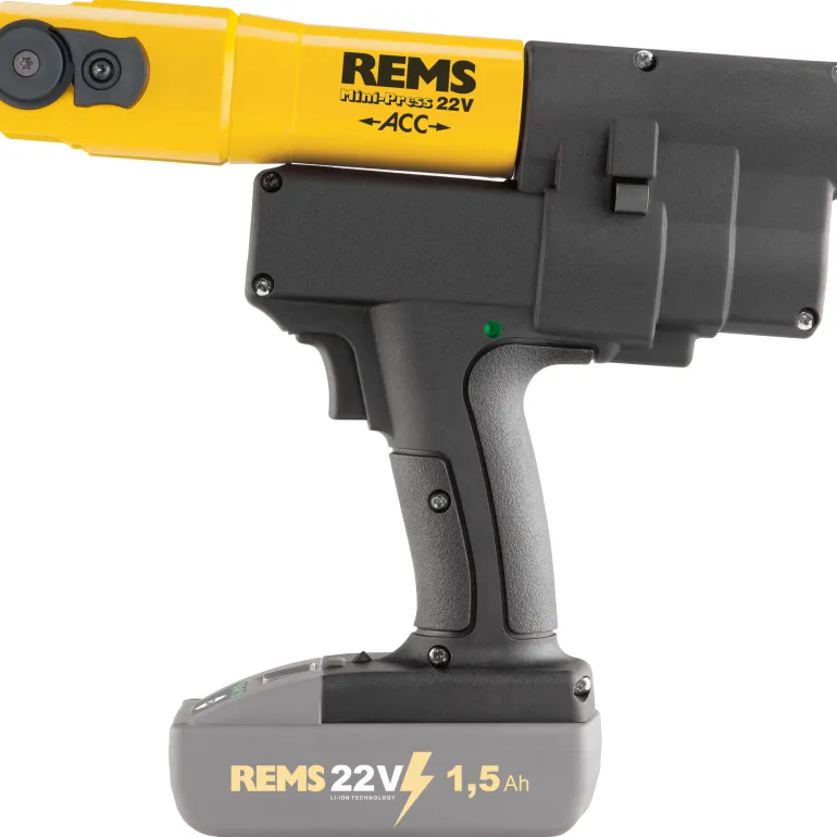 REMS Mini-Press S 22 V ACC on akkukäyttöinen puristin, automaattinen palautus, puristusliitosten valmistukseen Ø 10 – 40 mm, Ø ⅜ – 1 ¼”. REMS-puristuspihtien käyttöön, Mini/puristusrenkaat. Kierrettävä puristustyökalun kiinnitys, automaattinen lukitus. Varustettu turvakytkimellä ja hätäpysäytyksellä turvallista työskentelyä varten.