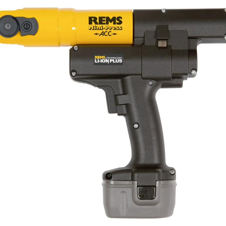 REMS Mini-Press ACC on 14,4 V:n akkukäyttöinen puristin, jonka teho on 380 W, automaattinen palautus. Puristin soveltuu puristusliitosten valmistukseen Ø 10 – 40 mm, Ø ⅜ – 1 ¼”. REMS-puristuspihtien käyttöön, Mini/puristusrenkaat. Kierrettävä puristustyökalun kiinnitys, automaattinen lukitus, LED-valaisin, työkohteen valaisemiseen.