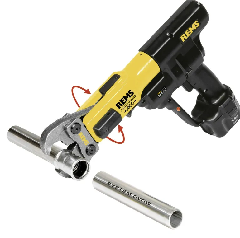 REMS Akku-Press ACC on kompakti, kätevä ja kevyt 14,4V:n puristin, jota voi käyttää missä tahansa, käsin, pään korkeuden yläpuolella, myös ahtaissa tiloissa. Optimaalinen painojakauma yhden käden käyttöön. Ergonomisesti muotoiltu kotelo, jossa on upotettu kahva. LED-työvalaisin