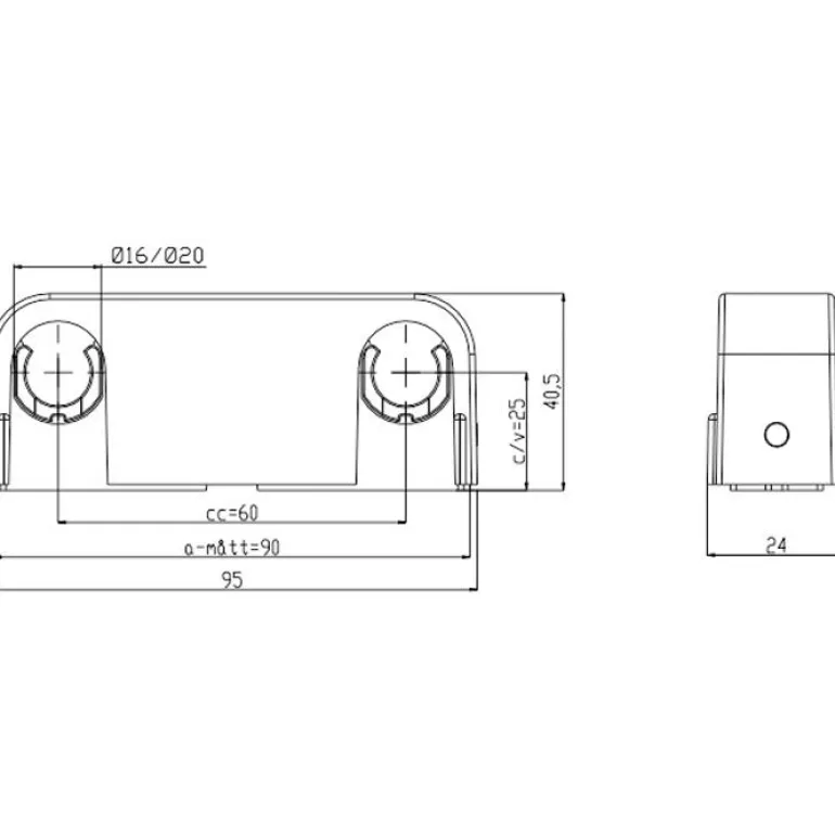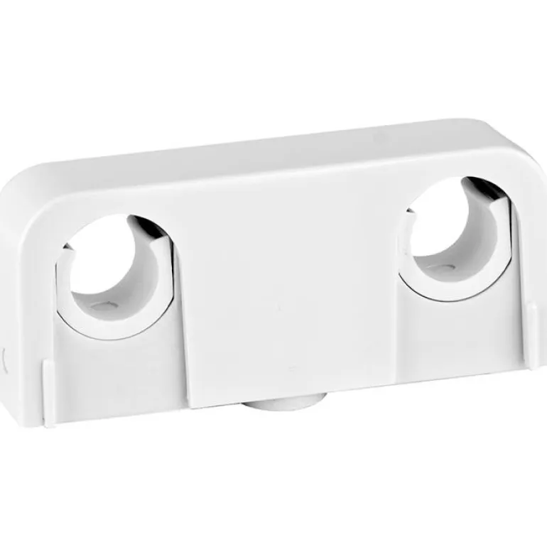 Valkoinen kaksiosainen putkikiinnike ulkohalkaisijaltaan 16/20 mm:n putkille. C/C-etäisyys on 60 mm ja C/V-etäisyys 25 mm.