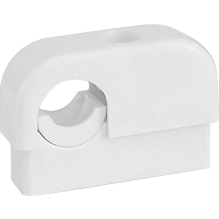 Valkoinen yksiosainen putkikiinnike ulkohalkaisijaltaan 15–22 mm:n putkille. Kiinnikkeen mitat ovat 65 x 40 x 20 mm. Mukana toimitetaan suojatulppa ruuvinreiän peittämiseen.