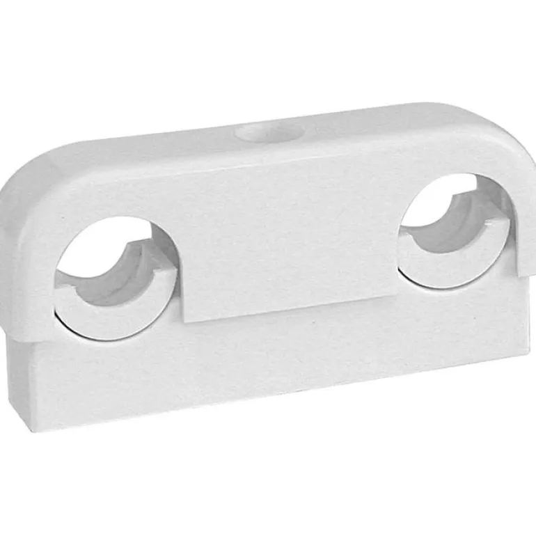 Valkoinen kaksiosainen kiinnike ulkohalkaisijaltaan 12–22 mm:n putkille. Puristimen C/C-etäisyys on 60 mm. Mukana toimitetaan suojatulppa ruuvinreikien peittämiseen.