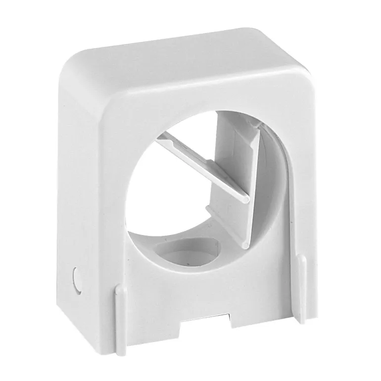 Valkoinen kaksiosainen putkikiinnike lukituskannella. Ulkohalkaisijaltaan 25/28 mm:n putkille. Kiinnikkeen C/V-etäisyys on 25 mm ja materiaalina ABS/PP-muovi.