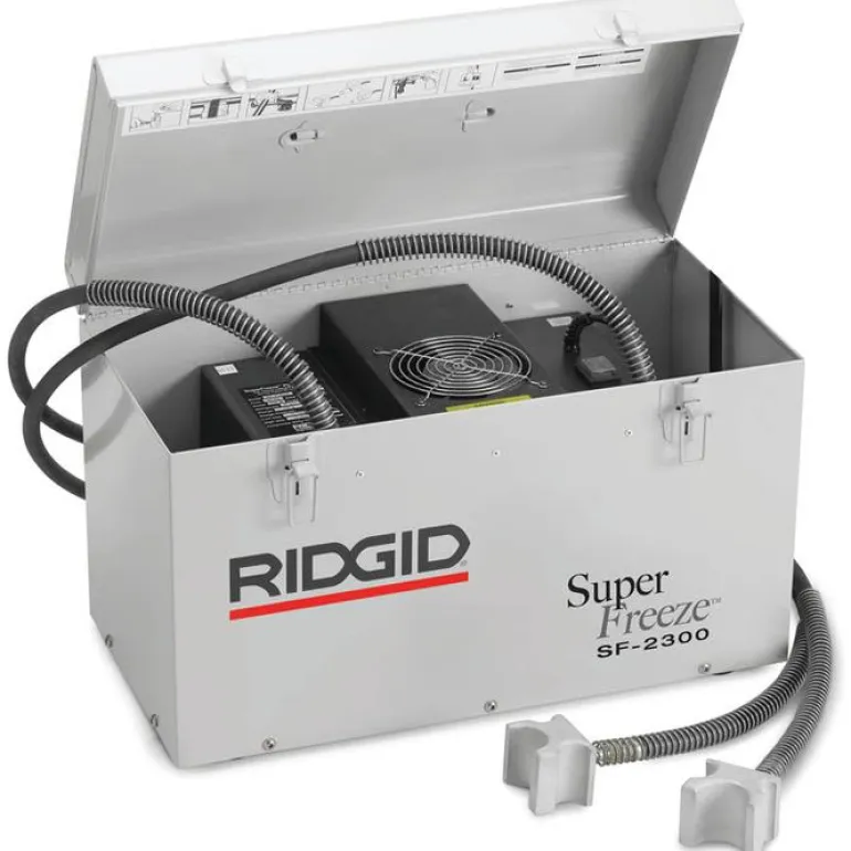 Ridgid SF-2300 SuperFreeze on jäädytyskone 12–35 mm:n teräs- ja 12–42 mm:n kupariputkien jäädyttämiseen. Ominaisuudet Tehokas kompressori sekä 3-onteloiset suorajäädytyspäät muodostavat jäätulpat muutamassa minuutissa.Lisäjoustavuutta saadaan käyttämällä 3-onteloisiin päihin 12, 15, 22, 35 mm teräs- ja kupariputkille tarkoitettuja sisäkkeitä.Kannettava ja kestävä – ei isoja kaasupulloja. Itsenäinen, metallikotelon suojaama, kuljetusta sietävän kompressorin sisältävä laitteisto on helppo kantaa työkohteesta toiseen. Ei vaarallista hiilidioksidia eikä myrkyllisiä kaasuja. Kylmäaine ei sisällä kloorattuja fluorihiilivetyjä.Korjaukset voidaan tehdä putken jäätyneen osan lähellä, eikä koko järjestelmää tarvitse tyhjentää. Suunniteltu jatkuvaan käyttöön – ei vaaraa CO2:n loppumisesta korjauksen aikana.Tehokas 296 W:n kompressori.Letku kytketään kohtisuoraan jäädytyspäähän. Helpottaa työskentelyä ahtaissa paikoissa sekä seinän ja lattian lähellä olevilla putkilla. 2,5 mm paksut, 1,98 m pitkät kumiletkut on suojattu kulutuskestävillä jousilla, jotka varmistavat letkun pitkän käyttöiän. Ainutlaatuinen Freeze Gel -hyytelö tarttuu jäädytyspäihin tippumatta pois ja auttaa vähentämään jäätymisaikaa.