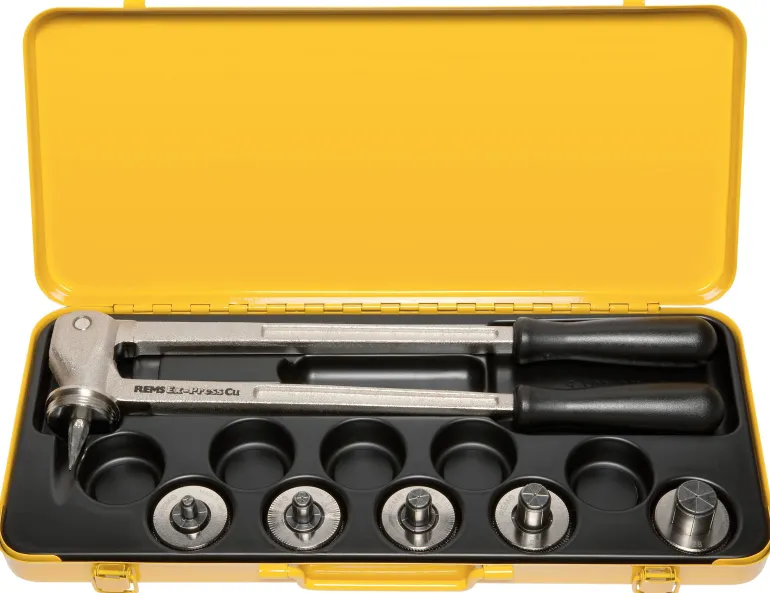 REMS Ex-Press Cu Set on käsiputkenlaajennin Ø12 – 22 mm. Laajennuspihdit, joissa on laajennuspäät 12, 14, 16, 18 ja 22 mm:n putkille. Tukevassa teräspeltikotelossa.