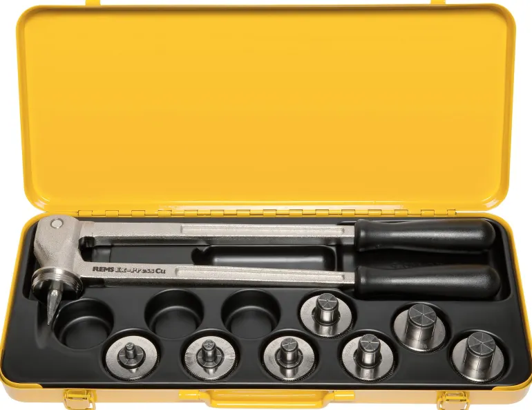REMS Ex-Press Cu Set on käsiputkenlaajennin Ø12 – 32 mm. Laajennuspihdit, joissa on laajennuspäät 12, 14, 16, 18, 22, 28 ja 32 mm:n putkille. Tukevassa teräspeltikotelossa.