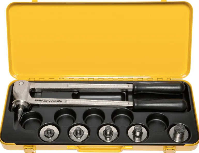 REMS Ex-Press Cu Set on käsiputkenlaajennin Ø12 – 28 mm. Laajennuspihdit, joissa on laajennuspäät 12, 15, 18, 22 ja 28 mm:n putkille. Tukevassa teräspeltikotelossa.