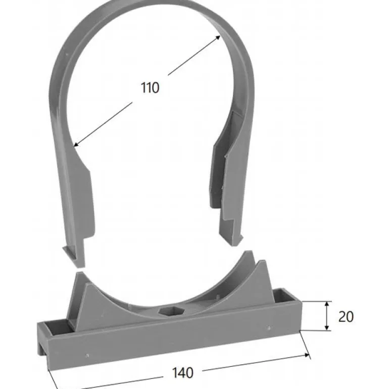Harmaa putkikiinnike putkille, joiden ulkohalkaisija on 110 mm. Mitat 140 x 20 x 130 mm, valmistettu PP-muovista.