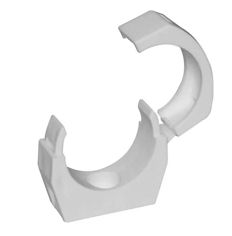 Valkoinen yksiosainen putkikiinnike lukituskannella. Putkille, joiden ulkohalkaisija on 50 mm. Kiinnikkeen mitat ovat 65 x 23 x 70 mm