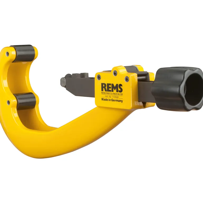 REMS Cu-INOX 64 – 120 putkileikkuri putkille Ø 64/ 120mm tai Ø 2.1/2 – 4″, seinämäpaksuus s 4mm. Syöttöakselin nopea säätö molempiin suuntiin, ergonomisesti muotoiltu, kätevä metallinen kiertokahva helpottaa työskentelyä ja pidentää käyttöikää.