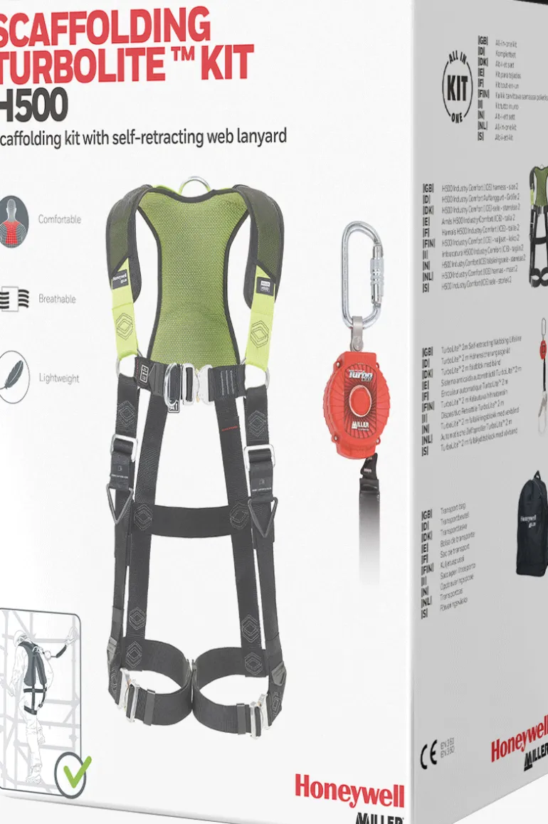 Putoamissuojainsarja Miller Scaffolding Turbolite Kit on soveltuva telinetyöskentelyyn. Honeywell H500 IC6-turvavaljaat ovat kevyet ja sujuvat käyttää turvallisuusnäkökulmat huomioiden. Varustetut olkapää- ja selkäpehmusteilla käyttäjämukavuutta varten.