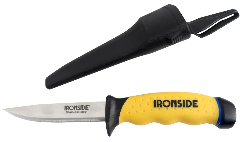 Terä kiillotettua, ruostumatonta terästä. Ergonomisesti muotoiltu kumikädensija, sormisuojus. Tuppi muovia.