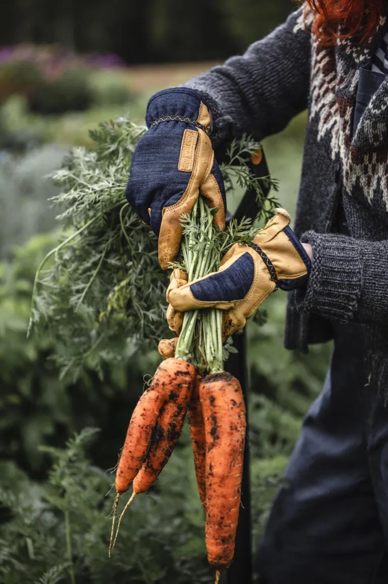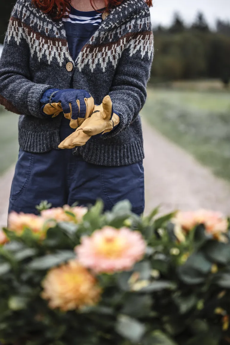Monipuolinen ja joustava käsine puutarhanhoitoon. Käsine on tehty vuohennahasta ja siinä on vahvistetut sormet ja farkkupäällinen.