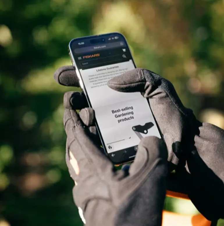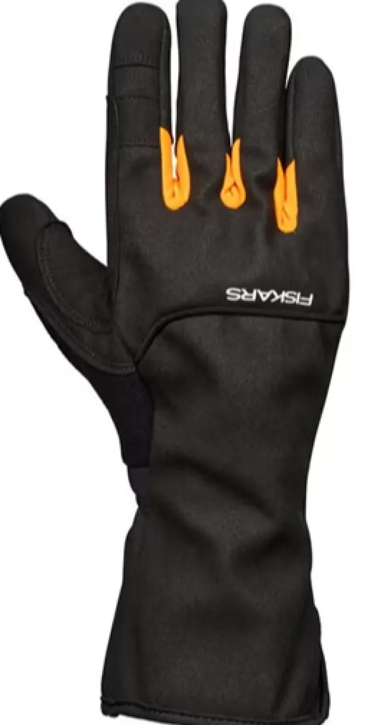 Fiskars-suojakäsineet suojaavat käsiä ja ranteita esimerkiksi piikikkäitä marjapensaita käsitellessä. Tekonahkaisissa käsineissä on kestävyyttä parantavat, iskusuojaavat pehmusteet. Lisäksi ne ovat tavallista pidemmät, jotta myös käsivarret saavat suojaa. Niissä on vahvike peukalon ja etusormen välissä ja hengittävä verkkokangas kämmenselässä kestävyyden takaamiseksi.