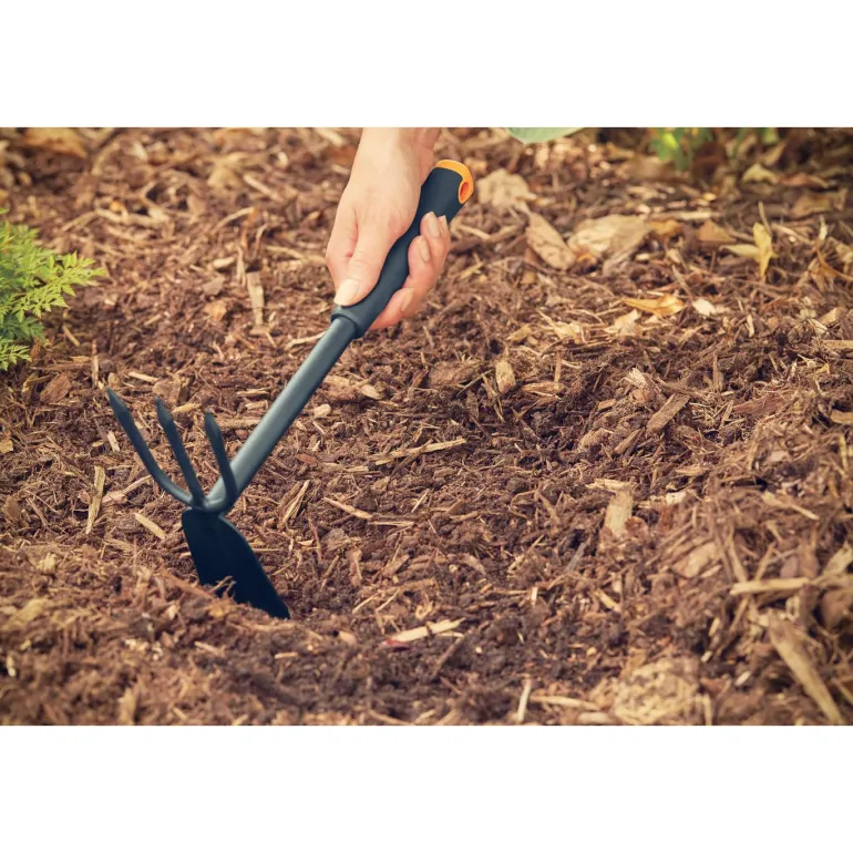 Hakku ja möyhennyskuokka yhdessä. Maaperän ja rikkaruohojen puhdistamiseen.