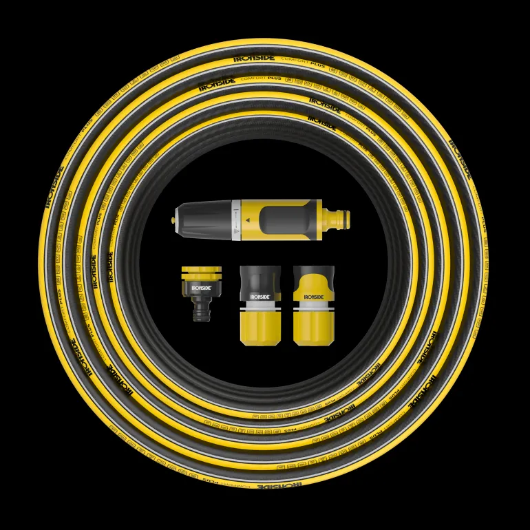 Ironside 500338 on puutarhaletkusetti sisältäen 6-kerroksisen neulotun puutarhaletkun, 1/2″ 12,5 mm x 20 m. Sisältä mustaa sileää PVC-materiaalia, jossa on levänestokäsittely. Ulkopuolinen väri keltainen/musta.