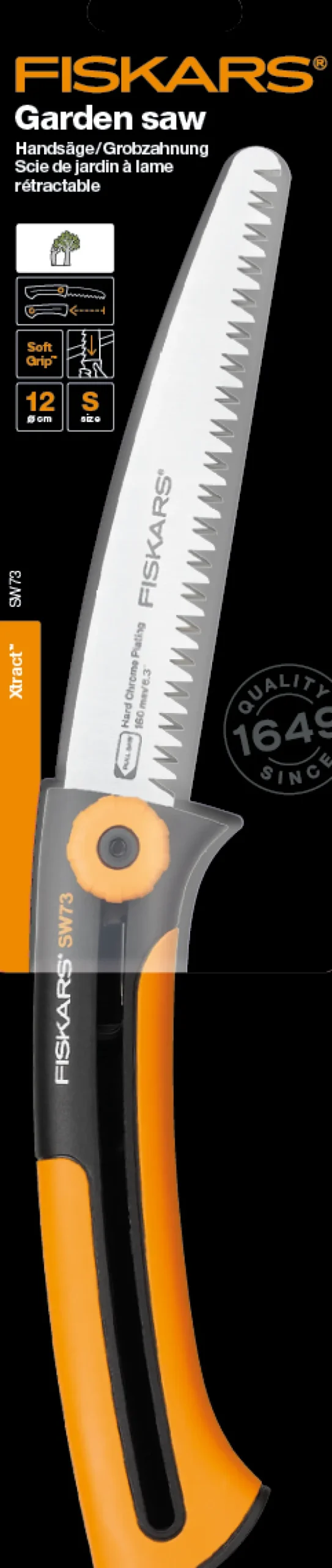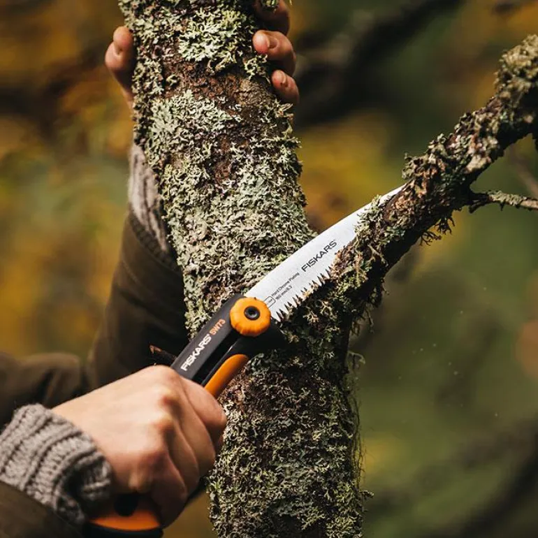 Fiskars SW73 on 160 mm erittäin tehokas saha joka on muotoiltu erityisesti tuoreelle puulle. Sahan terä puree parhaiten vetäen. Mikä parasta, SoftGrip kahva takaa tukevan otteen. Ontto kahva mahdollistaa terän säilytyksen kahvan sisällä kuljetuksen ajan. Saha on täydellinen mukaan esimerkiksi retkelle, voit säilyttää sitä vyölenkilläsi ja terä pysyy suojassa kahvan sisällä.